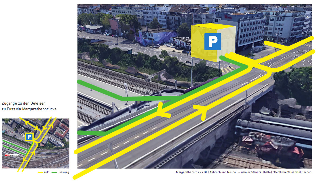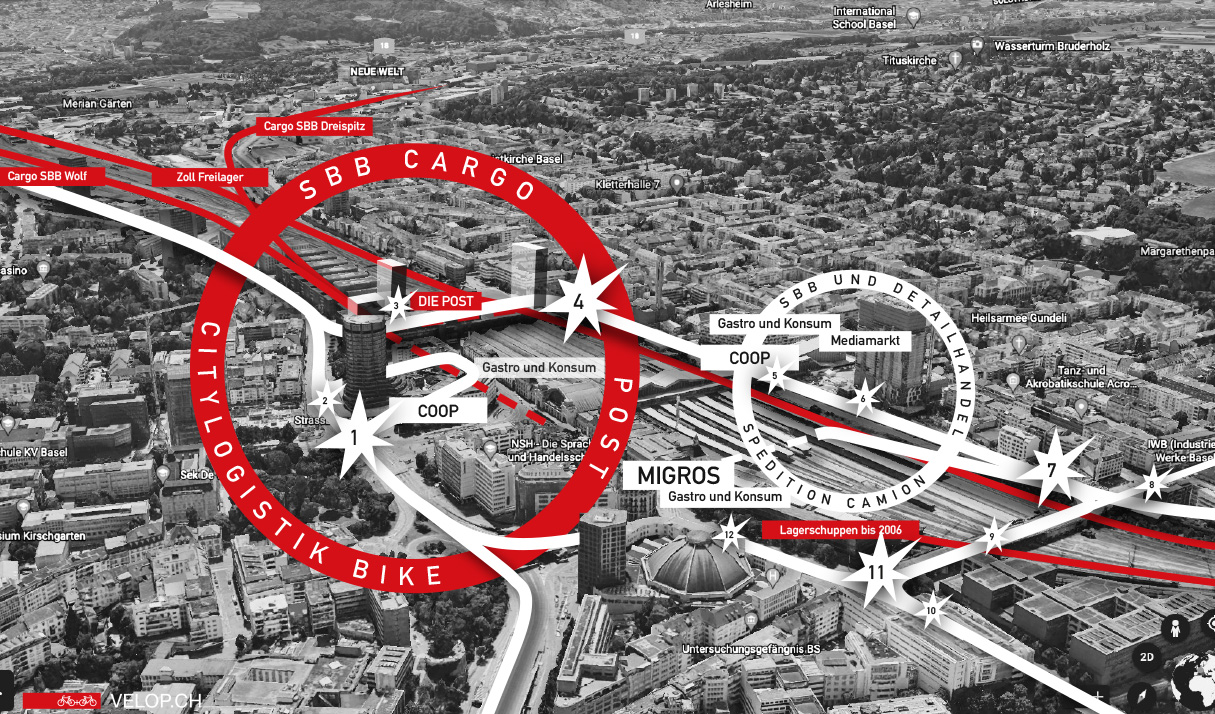 Der Ausbau der Kapazitäten bei der Personenbeförderung bei gleichbleibendem Durchsatz der Züge bringt SBB Cargo praktisch zum Erliegen. Selbst die Anlieferung an Coop- und Migrosfilialen, Gastro und Konsum direkt am Gleisfeld oder im Bahnhof gelegen wird auf der Strasse [weiss] befördert. Die LKWs weiderum bringen ausgerechnet beim emissionsfreien Gleisfeld den Veloverkehr zum Erliegen. Die Probleme sind enge Velowege [1], gefährliches Kreuzen [2,3,4], Rechtsabbiegen [5,6,7,8,9], fehlende Velospur [10,11] und in die länge gezogene Spurenwechsel. In Zukunft sollen auch Kapazitäten an der provisorischen Buskannte 50 [12] zum Flughafen gesteigert werden, ähnlich wie man auch den Fernbusmarkt spielen lässt. Die Stimmen von getrennten Velowegen werden laut. Die Rücksichtnahme auf die LKW-Flut ist aber nicht gratis. Wer soll die Velowege bezahlen?