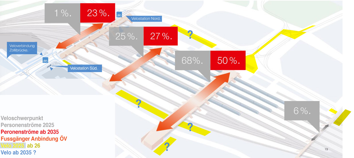 Mit Nachdruck wurde von Seiten VCS / Pro Velo beider Basel schon bei der Präsentation des Vorprojekts auf die Fehlplanung hingewiesen. Im Bericht der Raumplanungskomission ist in der Folge verbindlich festgehalten. Zitat: Zusätzlich zu den gemäss Gesetzgebung erforderlichen Veloabstellplätzen sind 400 öffentliche Veloabstellplätze zu realisieren, die bei nachgewiesenem Bedarf erweiterbar sind. Diese müssen von der Hochstrasse / Solothurnerstrasse und der Gartenstrasse aus fahrbar erreichbar und untereinander verbunden sein sofern technisch und verhältnismässig umsetzbar. Die Perrons müssen von dort direkt angebunden sein. Zitat Ende. Der Passus sofern technisch und verhältnismässig umsetzbar wird dank einer Motion im Nachhinein von der Kommission einstimmig aus dem Plan gestrichen. Leider muss immer wieder der Finger auf diesen Punkt gelegt werden.