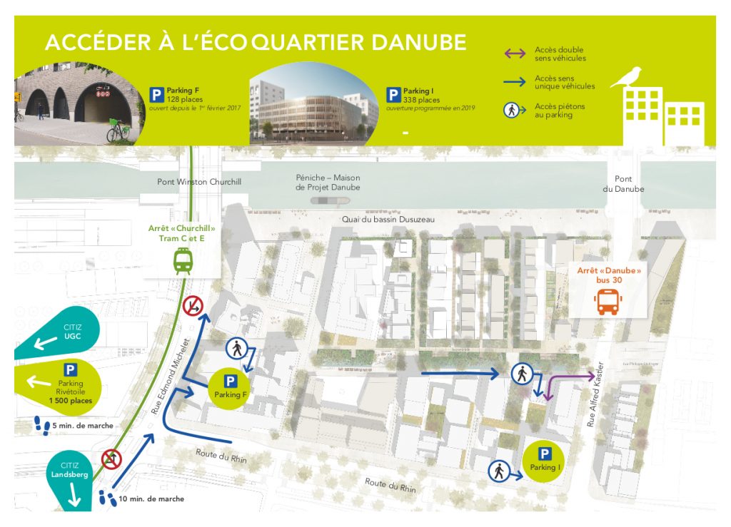 Das sogenannte Ecoquartier Danube in Strassburg FR ist ein neues Wohnviertel in Zentrumsnähe, begrenzt durch die N4 im Süden und dem Dusuzeau-Becken im Norden. Das Areal ist als eine grüne und zu Fuss gut erschlossene Oase im Herzen der Stadt geplant. Das funktional und formal gemischte Quartier – Geschäft und Lebendigkeit im Süden, Ruhe und Entspannung im Norden, Urbanität im Westen und große Einrichtungen im Osten – öffnet sich mit zwei neuen Langsamverkehrsverbindungen über die Rheinstraße nach Neudorf und bietet eine urbane, aber durchlässige Front zum Dusuzeau-Becken.