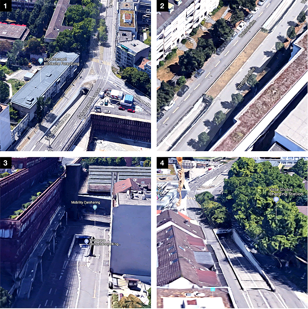 1 ) Schanzenstrasse, Ein-/Aus Kinderspital-Parking 2 ) Wettsteinallee, Ein-/Ausfahrt Roche-Parking 3) Gartenstrasse, Ein-/Ausfahrt Centralbahnparking und 4) Schanzenstrasse talwärts.