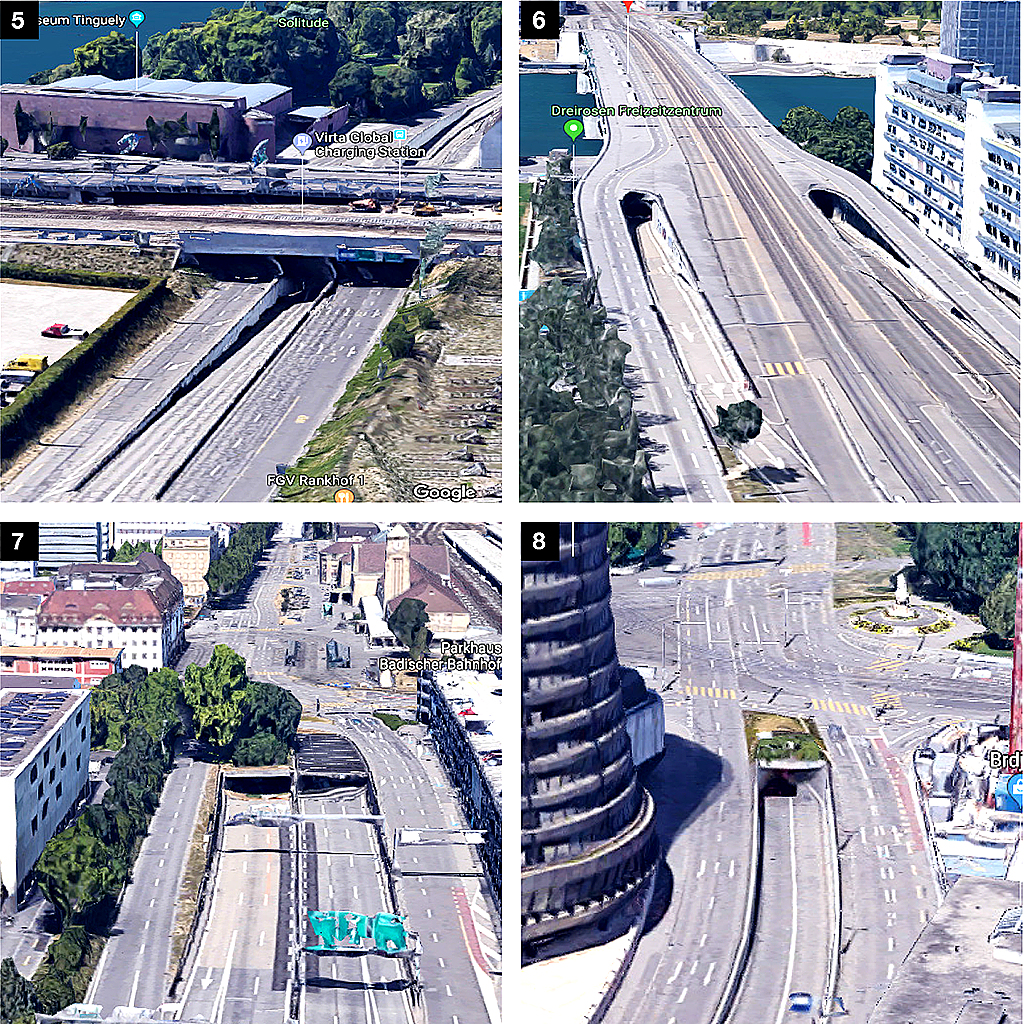 5 ) Grenzacherstrasse, Ein-/Ausfahrt Transit, 6 ) Dreirosenbrücke, Ein-/Ausfahrt Autobahn, 7 ) Schwarzwaldbrücke, Ein-/Ausfahrt Autobahn, 8 ) Nauenstrasse, Ein-/Ausfahrt Ringstrasse