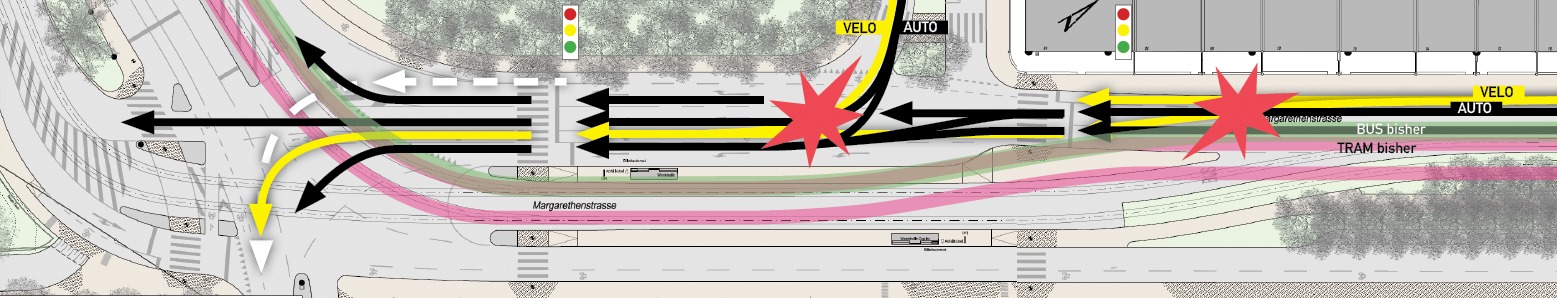 Wie Recherchen ergeben bietet der Plan für Velofahrer-/innen keine substanzielle Verbesserung. Für Fussgänger aus der Pruntruterstrasse bedeutet die Querung zum Drämmli an einer schmalen Stelle stehen statt wie vorher auf einer Fussgängerinsel. Velofahrer von der Pruntruterstrasse her kommend über die Margarethenstrasse das Velo schiebend überqueren wird zum Spiessrutenlauf. Rosa/Grün: Tram/Bus bisher.