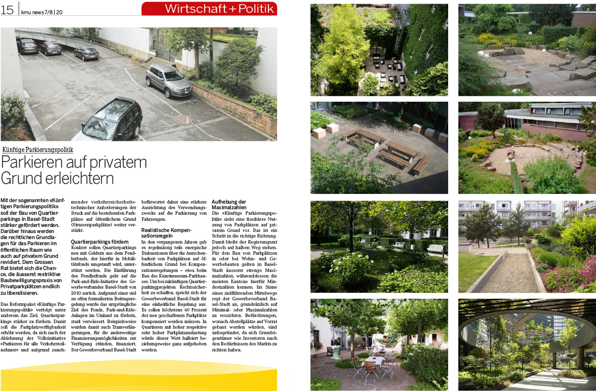 Der Gewerbeverband Basel-Stadt stellt sich nicht grundsätzlich gegen die Quartierparkplätze, spricht sich aber gegen weitere Regulierung aus, wenn auch sehr ungeschickt: Die Redaktion der Gewerbezeitung illustriert mit einem Negativbeispiel, die einseitig nutzbare Betonwüste, an Hässlichkeit kaum zu überbieten. Dort will uns der Immobilienmarkt haben: In einer Steinwüste!