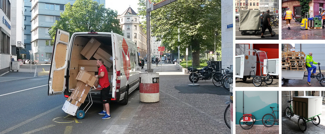 Bild links: Die Anlieferung aus Platzmangel auf der Velospur. Begrünen mittels Pflanzenrabatten oder Bäume zur Verbesserung des Mikroklimas ist damit verunmöglicht. Bild rechts: Feinverteilung von Microdepot zur Zieladresse mit Kleinstfahrzeugen.
