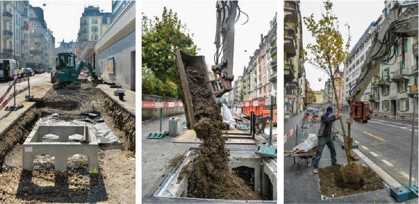 So werden Bäume in die vorverlegten Betontöpfe verpflanzt.