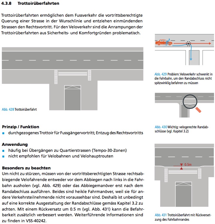 Das ASTRA empfiehlt die gefährlichen Randsteine bei Trottoirüberfahrten NICHT, die Ausführung im Detail den ausführenden Baufirmen überlassen. Da das günstigste Angebot in der Vergabepraxis des Kantons den Zuschlag erhält, sind bei allen Trottoirüberfahrten abgeschliffene Randstein zu sehen. Sie sind nicht velofreundlich, sondern die billigste aller Ausführungen einer Trottoirüberfahrt.
