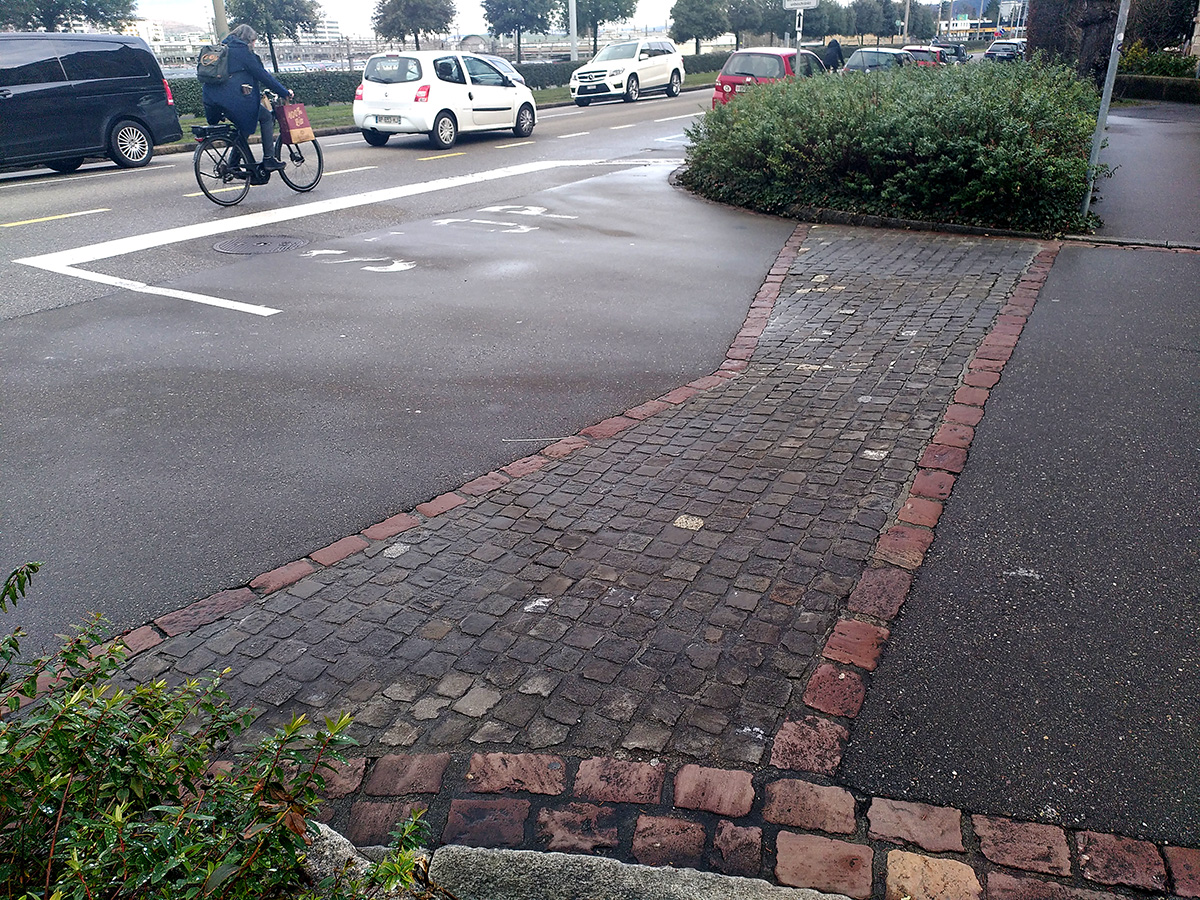 . Die ertastbare Längsmarkierung mit Farbe ist die bessere Führung für Sehbehinderte, da sie gleichzeitig um die Pfosten der Signale und Ampeln herumführen. Auch darum sind die scharfen Randsteine bei Trottoirüberfahrten – abgeschliffen oder nicht – ein Auslaufmodell. .Quelle: Behinderten- und velogerechte Randabschlüsse 03.04.2013