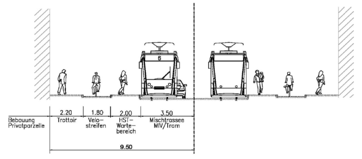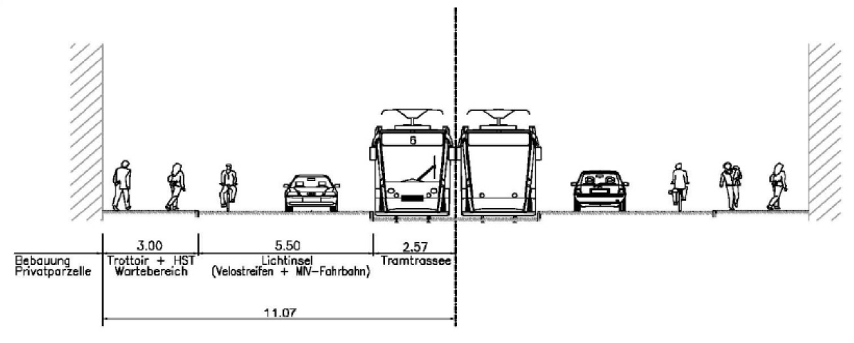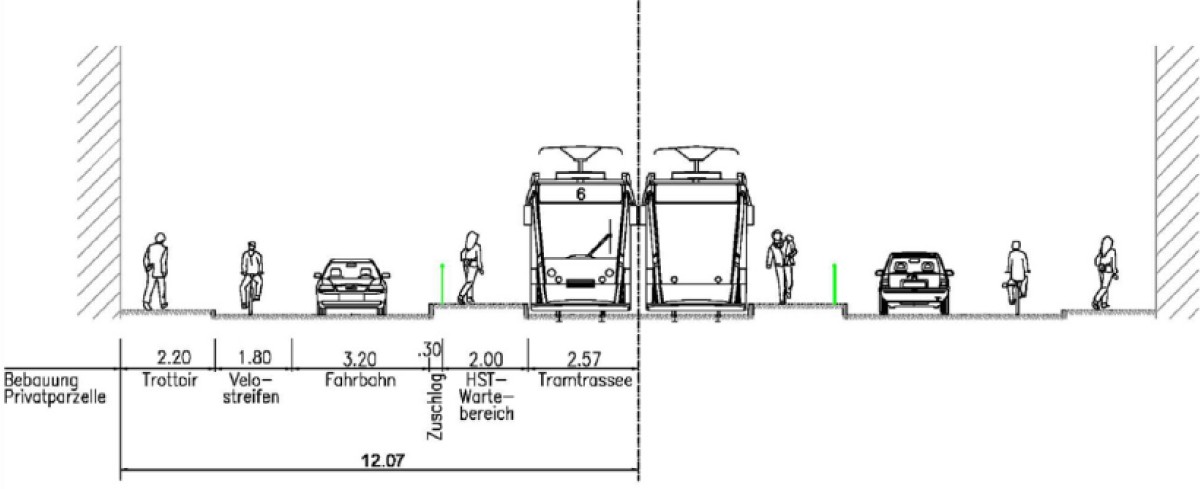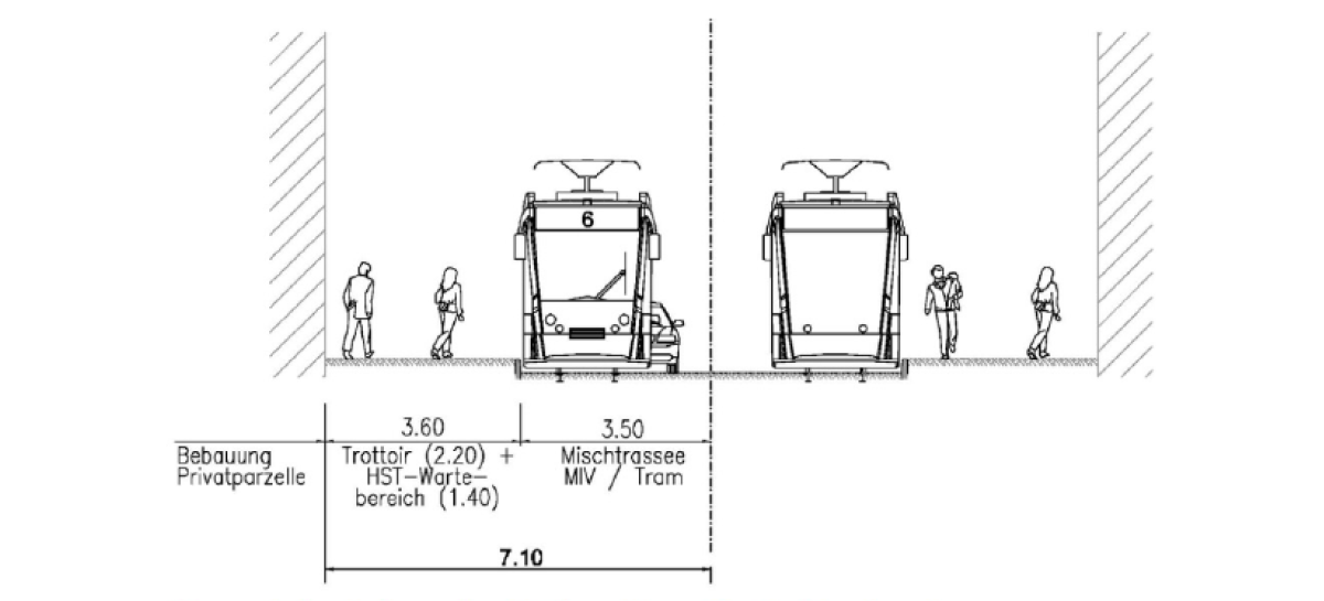 Beim Abschnitt Sevogelstrasse Grellingerstrasse handelt es sich um das eigentliche Zentrum der Hardstrasse mit verschiedenen Einkaufsmöglichkeiten. Hier sieht das Projekt einen nahezu unveränderten Strassenquerschnitt vor (vgl. Abbildung 4). Das Tram kann Velofahrende nicht überholen, dafür hat es Parkplätze auf beiden Seiten. Die Parkplätze sollen ebenfalls auf Niveau Trottoir markiert werden und könnten deshalb (im Gegensatz zu Parkbuchten) theoretisch ohne bauliche Anpassungen auch anders genutzt werden.
