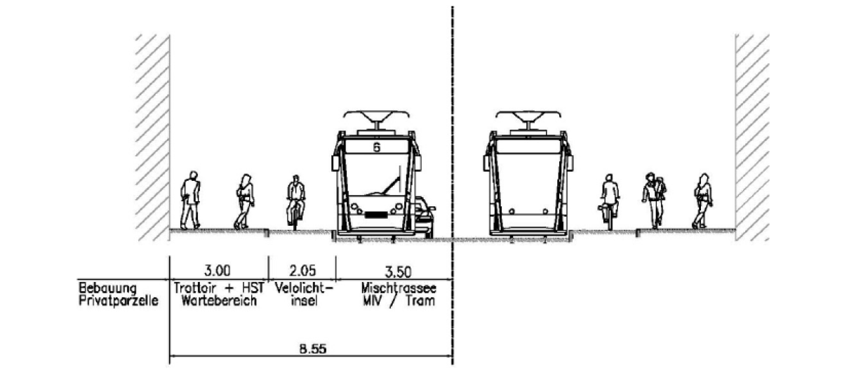 Die Breite von fünf bis sechs Metern für eine Velolichtinsel setzt sich zusammen aus Bereichen für Velofahrende, für auf das Tram wartende Leute und für längs passierende Fussgängerinnen und Fussgänger. Steht den zu Fuss gehenden zu wenig Platz zur Verfügung, gehen oder warten sie auf dem für das Velo vorgesehenen Bereich. Aufgrund der hohen Haltekante und angesichts der steigenden Zahl an Lastenvelos und Velos mit Anhängern muss zudem ein von der Strasse abgehobener Velobereich breiter sein als ein Velostreifen auf Niveau Fahrbahn.