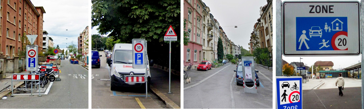 Strasseninventar in Quartierstrassen. Auf dem Signal ist das Velo nicht zu sehen, im Gegensatz zur Begegnungszone Signal in Frankreich (kleines Bild).