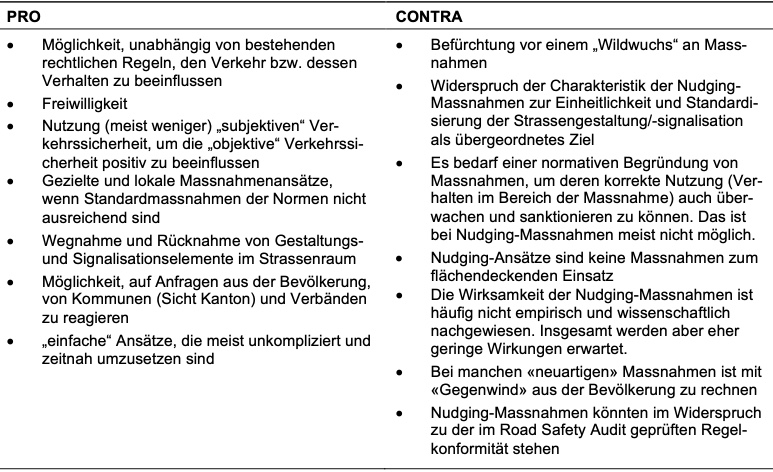 Anhand der bisherigen Forschung dazu lässt sich zusammenfassend sagen, dass Nudging-Massnahmen mehrheitlich als positiv und nützlich für die Verkehrssicherheit bewertet werden – insbesondere dann, wenn diese nur minimal eingreifend und leicht zu umgehen sind.