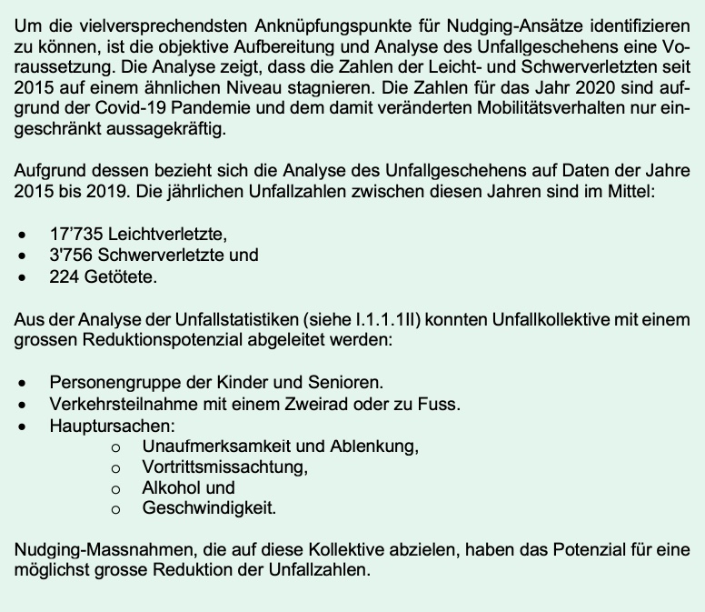 In einem nächsten Abschnitt (Kapitel 3*) erfolgt aufbauend auf einer grundsätzlichen Strukturierung des Unfallgeschehens sowie ausgehend von den bis dahin identifizierten Nudging-Ansätzen eine Systematisierung der Nudging-Techniken anhand von Strategien des sicheren Verkehrsverhaltens. Dies soll einen einfacheren Zugang zu den Massnahmen für die Praxis ermöglichen. Dabei wurde auch eine grobe Abschätzung der Potenziale in Bezug auf das adressierte Unfallgeschehen vorgenommen.