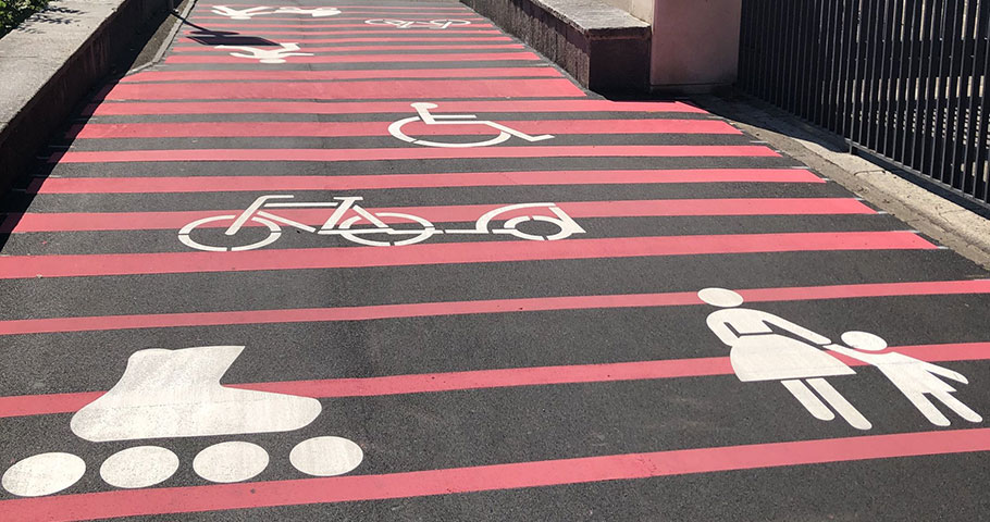 Für Zufussgehende (hier vor allem die Kinder) geben die BFU-«Fuessli» Orientierung, um die Laufwege in Richtung sicherer Querungsstellen zu lenken bzw. dazu zu motivieren.