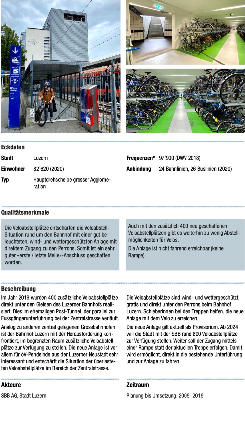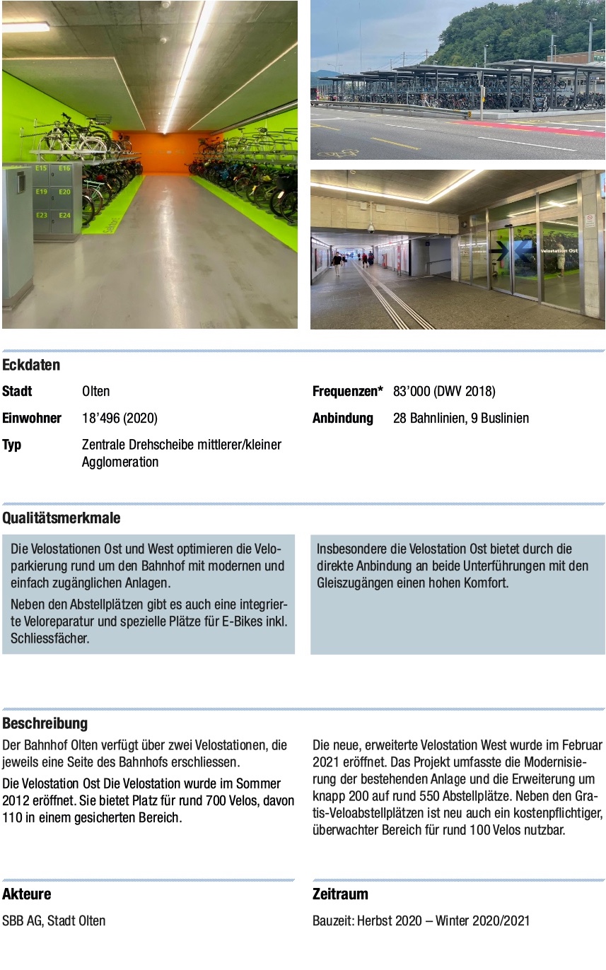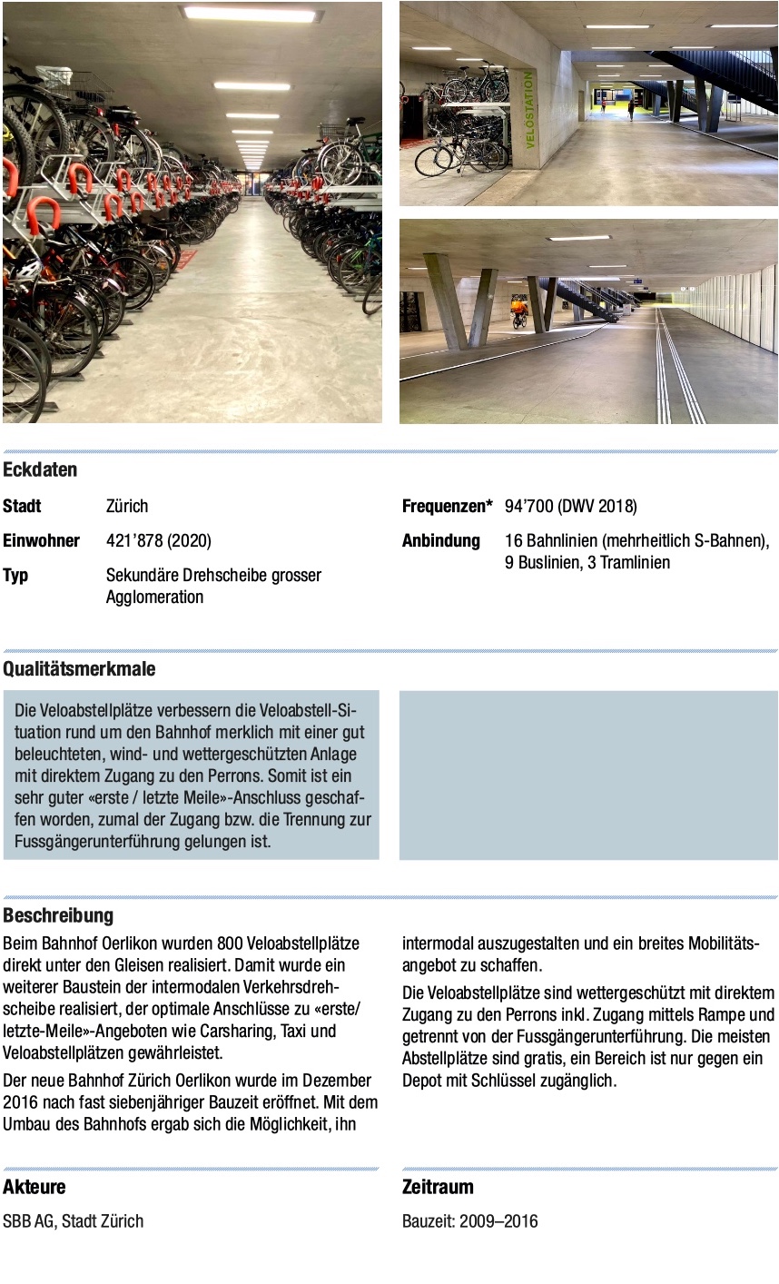 Die in der Planungshilfe angefügten Beispiele für Veloparkings sind leider ausschliesslich in Zusammenarbeit des ÖV (SBB) und der Kommune (Stadt oder Kanton) gezeigt. Nicht gezeigt sind Beispiele mit privaten Akteuren, was wir als einen entscheidenden Mangel der Planungshilfe sehen.