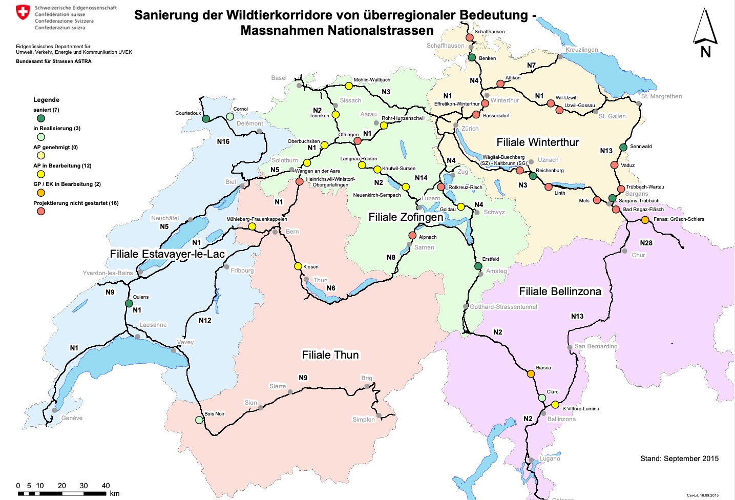 2001 wurde festgehalten, dass schweizweit 51 überregionale Wildtierkorridore durch wildtierspezifische Bauwerke zu sanieren seien. Insgesamt 40 davon queren die Nationalstrasse. 15 Jahre später war tatsächlich ein Viertel der Wildtierkorridore saniert oder in Realisierung.