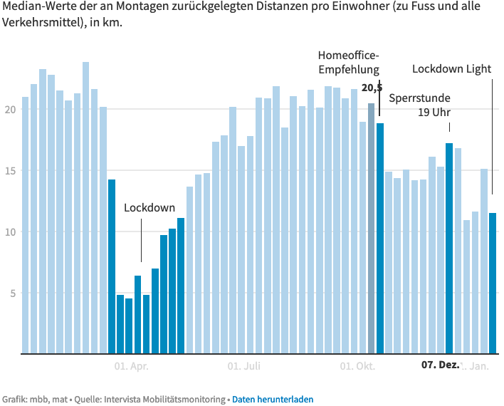 Am ersten Montag nach dem Lockdown im Frühling, am 23. März 2020, betrug die zurückgelegte mittlere Tagesdistanz 4,8 Kilometer. Dazu führte ein strenges Regime unter dem ersten Lockdown: Damals waren alle Schulen geschlossen und Geschäfte waren zu – auch Baumärkte oder Coiffeurgeschäfte. Am Montag in der dritten Kalenderwoche im Jahr 2020 betrug die zurückgelegte Tagesdistanz 22 Kilometer.